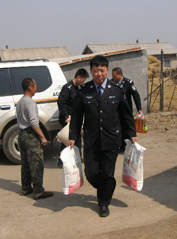 在开门评警活动中,县森林公安局干警到安山乡集贤村集贤屯刘金才家回访。刘金才因非法采伐国家重点保护植物罪被延寿县人民法院依法判处有期徒刑三年,缓期执行三年,并处罚金人民币三千元。当他们得知刘金才是村里的五保户,是家里唯一的劳动力,儿子患有小儿麻痹,有时靠上街唱歌乞讨填补家用时,为其送去大米、白面、豆油等生活用品,刘金才深受感动。